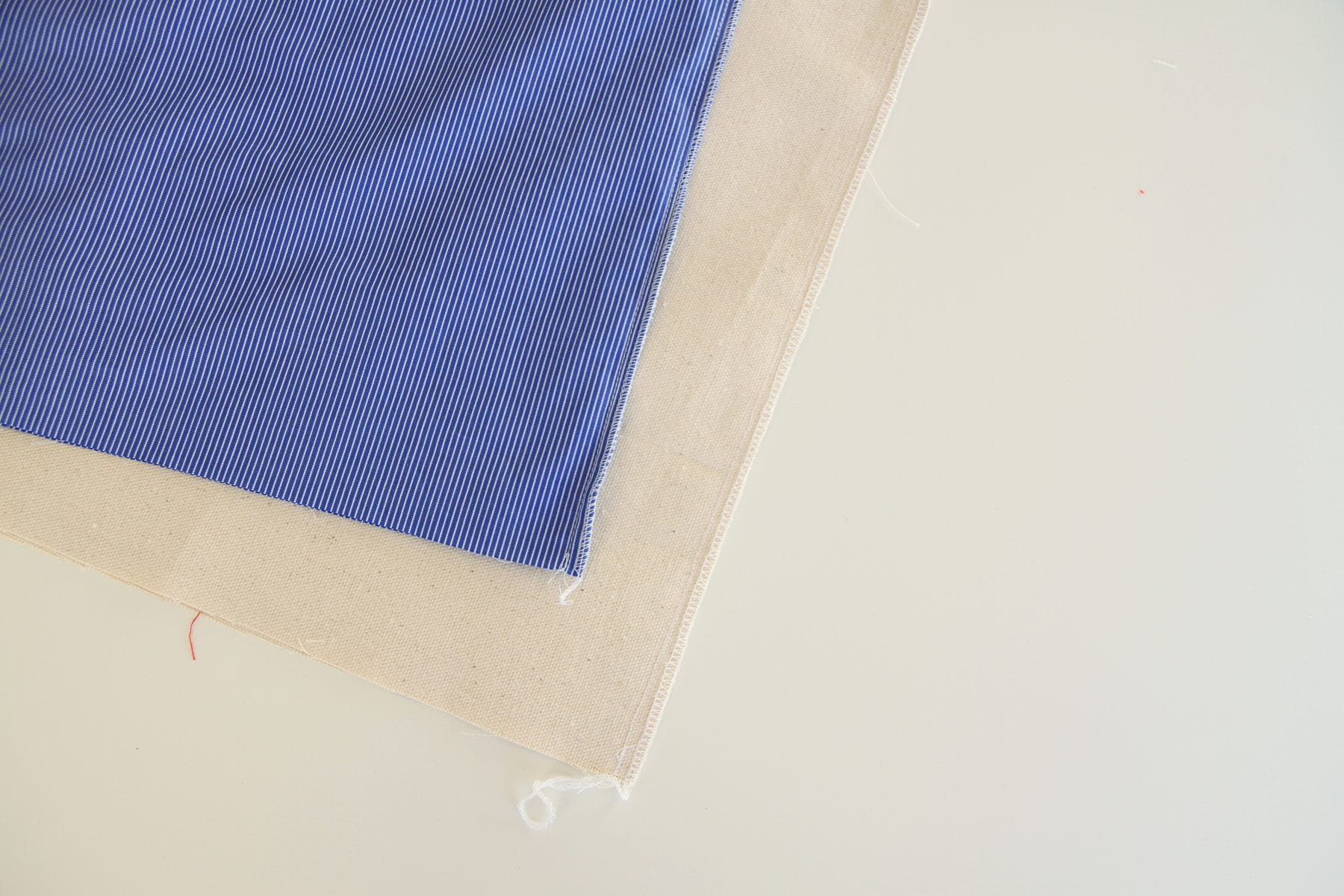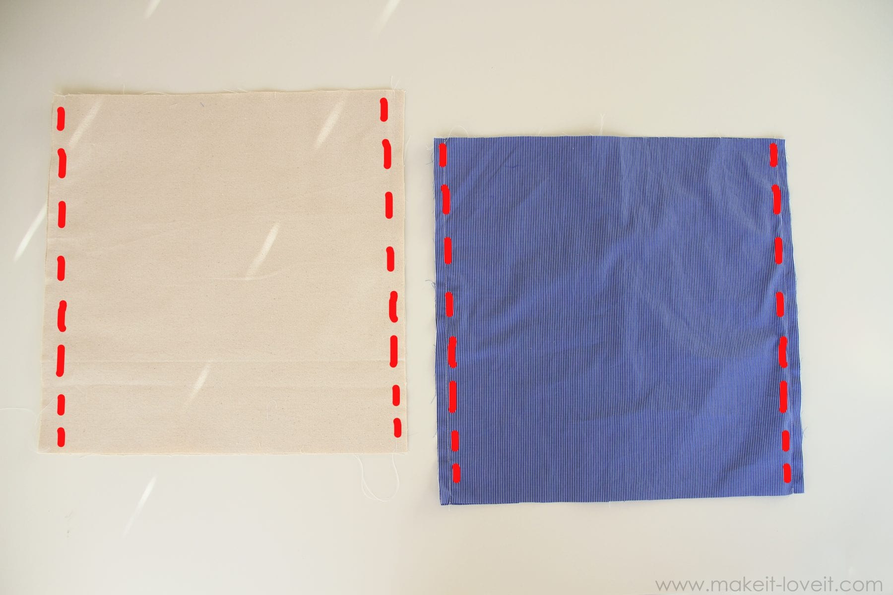 Em seguida, coloque os dois quadrados camisa juntos (com os lados direito juntos) e costurar ao longo das margens direita e esquerda, utilizando uma margem de costura 1/2 polegada. Faça o mesmo com os 2 pedaços de pano de pato.